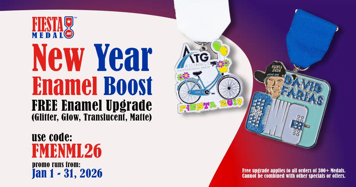 January is the perfect month to experiment with color and finish before Fiesta season ramps up. This offer lets you enhance your medal design with a premium enamel upgrade at no additional cost. Start strong and give your medals extra personality.